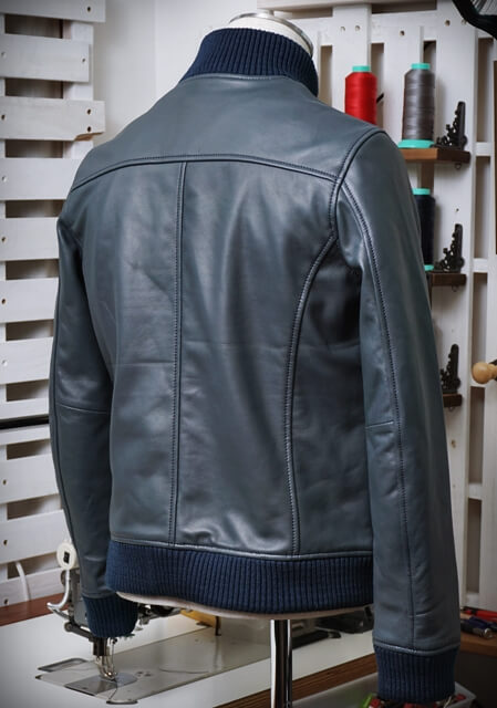 襟、袖口、裾にリブを使用した、ラム羊革ネイビーでオーダーメイドのご注文いただいた革ジャン・レザージャケットの立ち襟ブルゾンジャケットのご紹介です!